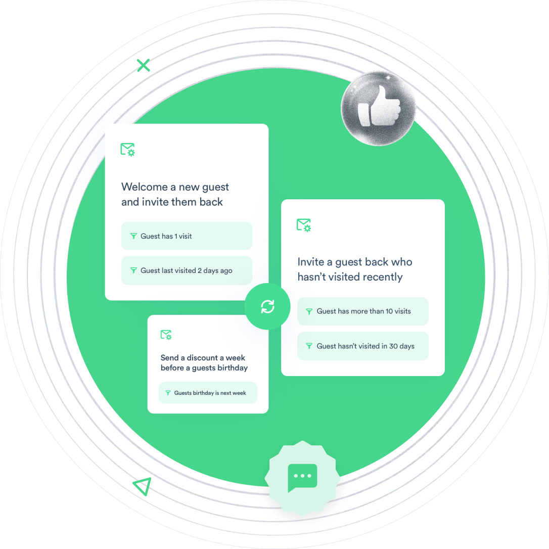 Use a text message marketing platform to trigger automated SMS messages based on how guests interact with your venue. You can ask questions, provide resources or offer coupons and discounts through SMS (short message service). Analytics shows you can expect 5x higher open rates with SMS marketing messages than with e-commerce email marketing. You can also expect even higher levels of engagement and conversion rates.